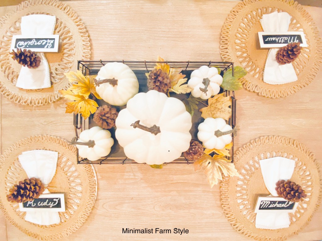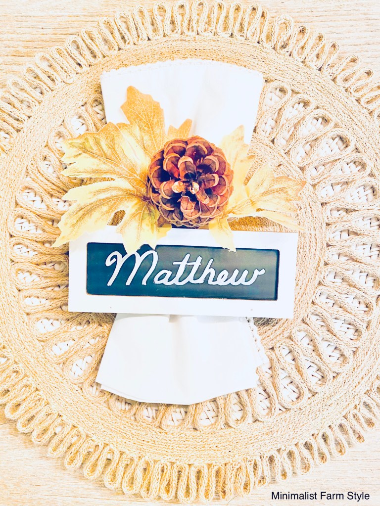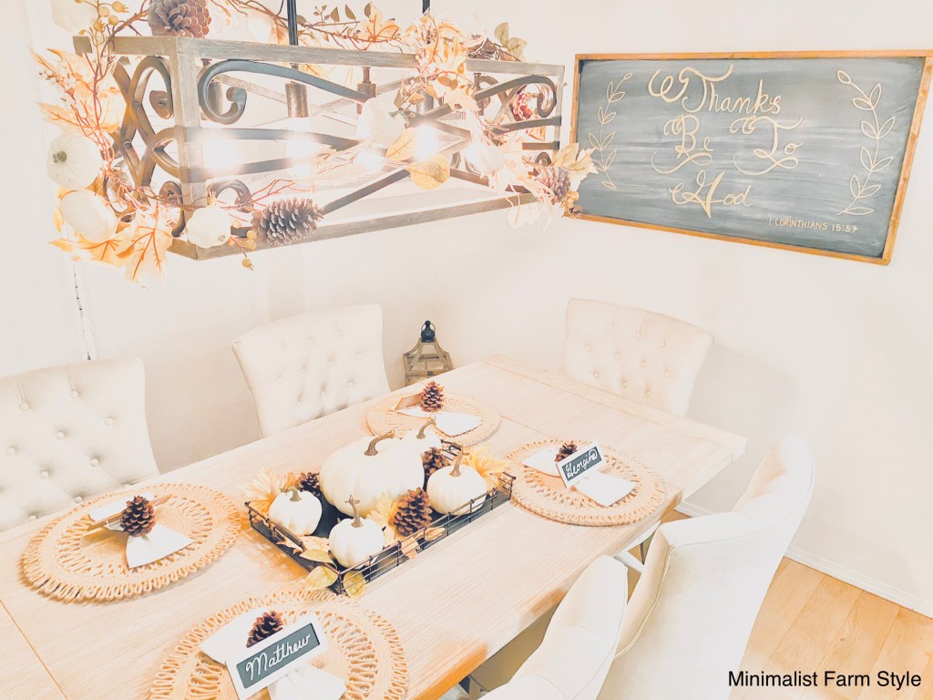 Below a seasonal frame, faux leaves, pine cones and a table mini-blackboard name tag was added to each charger to complete the Thanksgiving dinning room.