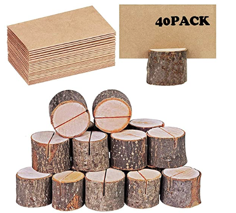 Click on the image to check out these rustic and reusable wooden bark table car holders.